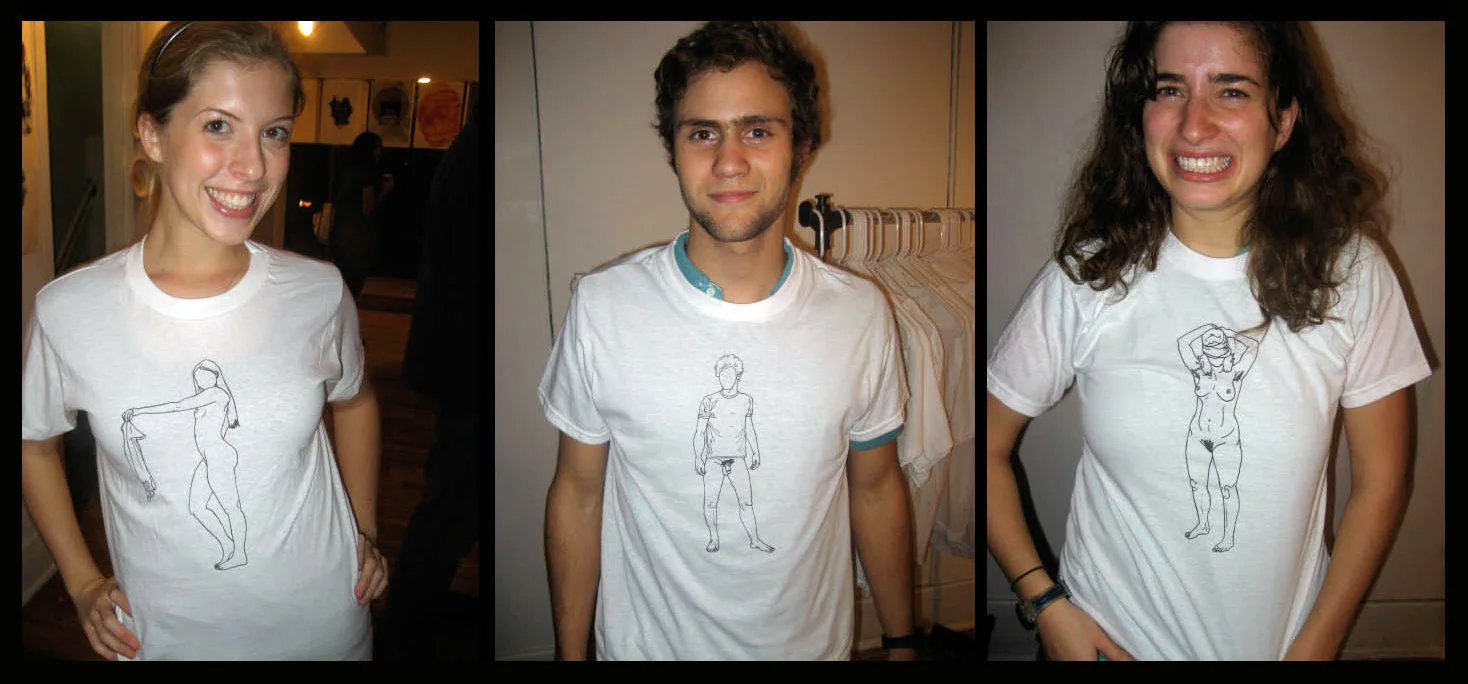 This project involved finding 42 people to pose nude for the camera. Participants were allowed to cover themselves however they pleased using only a white t-shirt. I transformed the images into faceless contour line drawings and screen-printed them back onto the same white t-shirts. Every participant received a t-shirt with his or her own image printed on front. While worn, the garments expose ones individual comfort level with nudity.